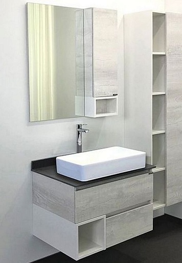 В комплекте: тумба, столешница, раковина, зеркальный шкаф, крепеж.