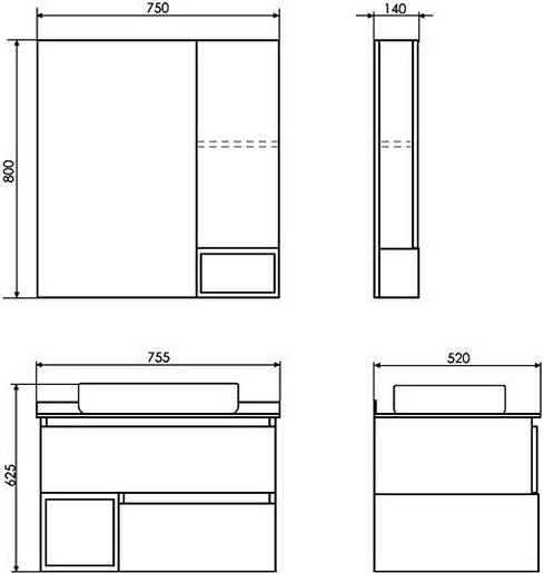В комплекте: тумба, столешница, раковина, зеркальный шкаф, крепеж.