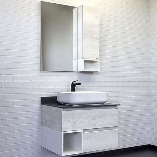 В комплекте: тумба, столешница, раковина, зеркальный шкаф, крепеж.