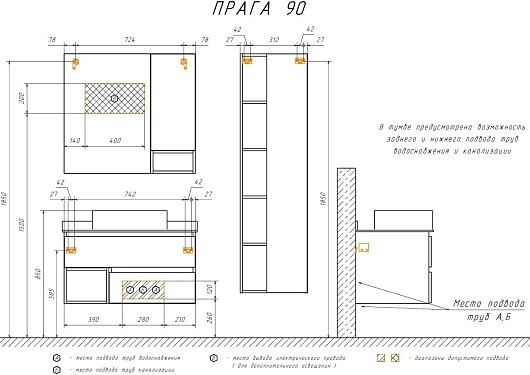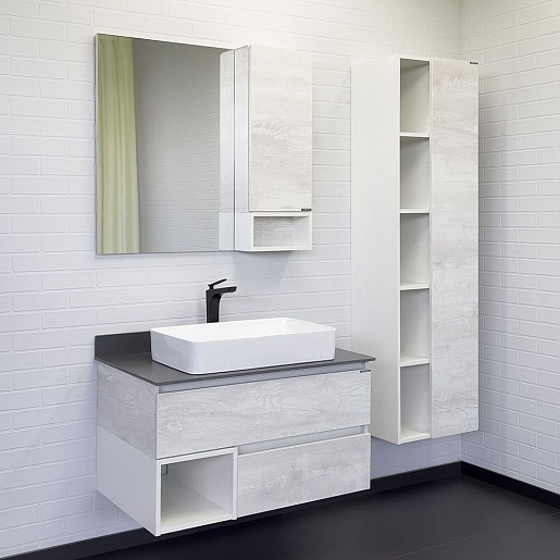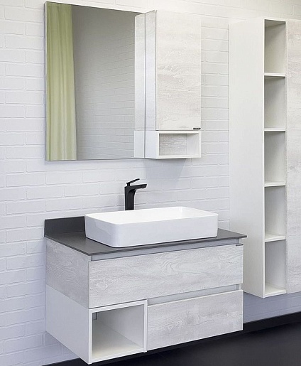 В комплекте: тумба, столешница, раковина, зеркальный шкаф, крепеж.
