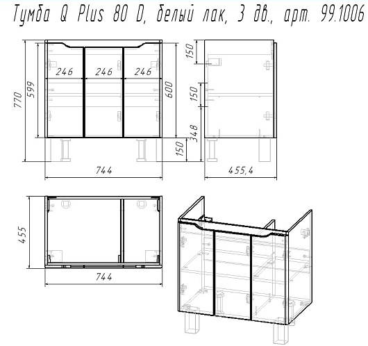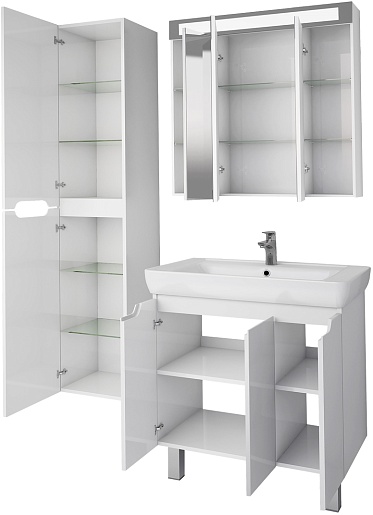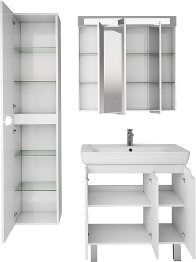 В комплекте: тумба, раковина, зеркальный шкаф, ножка (4 шт.), крепеж.