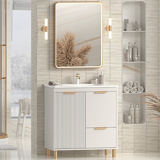 В комплекте: тумба, раковина, зеркало, крепеж, ножки.
