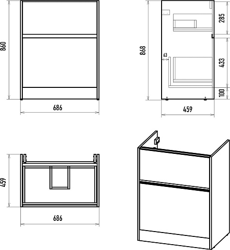 Комплектация: тумба, раковина, зеркало, ножки.