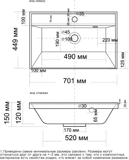 - Раковина из литьевого мрамора со слив-переливом.