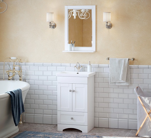 В комплекте: тумба, зеркало, раковина, ножка (4 шт.).