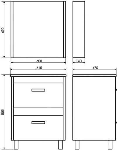 В комплекте: тумба, раковина, зеркальный шкаф, ножка (4 шт.).