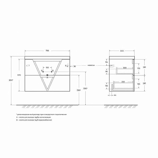 - База под раковину подвесная с двумя выкатными ящиками, с доводчиками, VITTORIA-800-2C-SO-GO-P