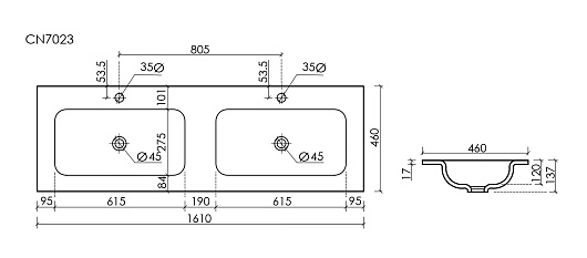 - Коллекция Grace. Размер 1610x457x137 мм, с двумя чашами и отверстиями под смеситель.
