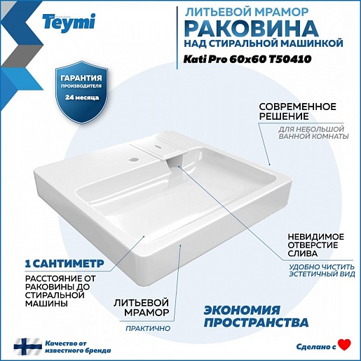 - Раковина над стиральной машиной Teymi Kati Pro T50410 60х60, белая.- Возможна установка над стиральной машиной.
