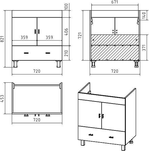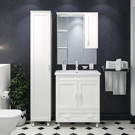 Комплектация: тумба, раковина, зеркальный шкаф, комплект креплений, ножка (4 шт.).