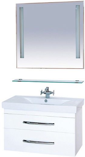 Комплектация: зеркало с двумя встроенными светильниками, стеклянная полочка.