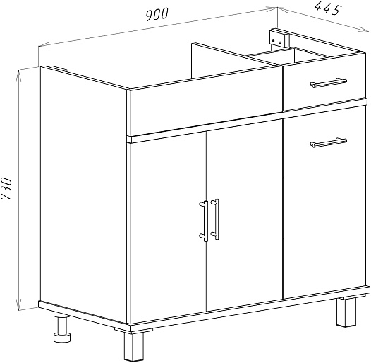 - Габариты корпуса тумбы (ШxГxВ): 900х438х727 мм.