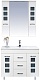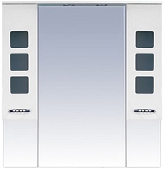 Комплектация: зеркальное полотно с козырьком со встроенной подсветкой, выключателем и розеткой. Распашные шкафчики со вставками из матового стекла и вкладной полкой.