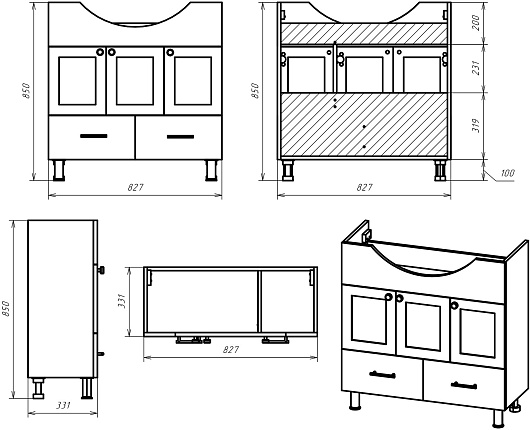 - Габариты корпуса тумбы (ШxГxВ): 827x333x752 мм.