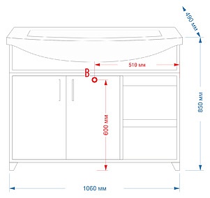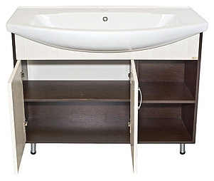 - тумба под раковину: 2 распашные дверцы, открытые полки, 2 металлические ручки, крепления и опорные ножки