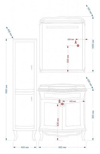 - тумба под раковину: 2 распашные дверцы, 2 ручки-подвески, полки