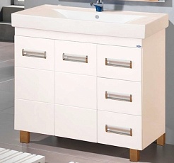 - тумба под раковину: 2 распашные дверцы, 3 выдвижных ящика, 5 врезных металлических ручки, вкладная полка, крепления и опорные ножки
