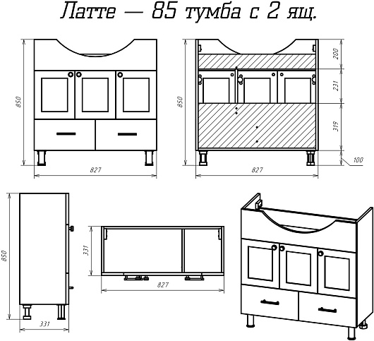 - Габариты корпуса тумбы (ШxГxВ): 827x333x752 мм.