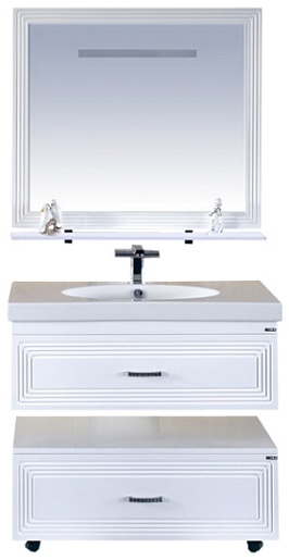 Комплектация: Тумба подкатная для ванной с выдвижным ящиком на направляющих с доводчиком. Хромированные ручки инкрустированные кристаллами, покрытие фасада и корпуса глянцевое.