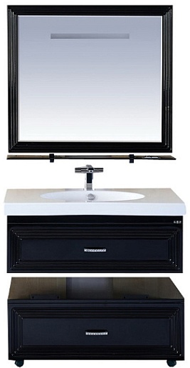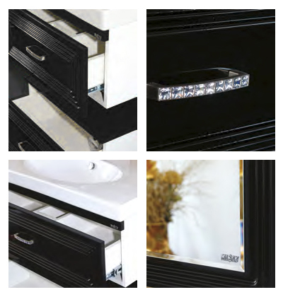 Комплектация: Тумба подкатная для ванной с выдвижным ящиком на доводчиках. Хромированные ручки инкрустированные кристаллами, покрытие фасада и корпуса глянцевое.