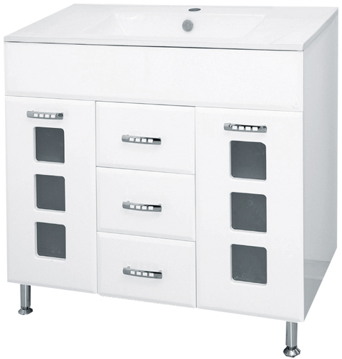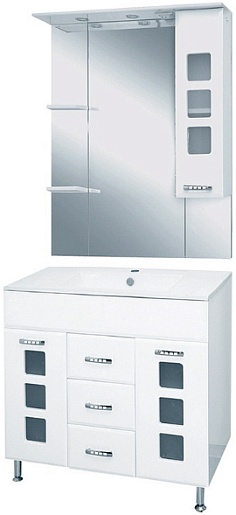 - тумба под раковину: 2 распашные дверцы с вставками матового стекла, 3 выдвижных ящика, 5 металлических ручек, комплект опорных ножек и крепления