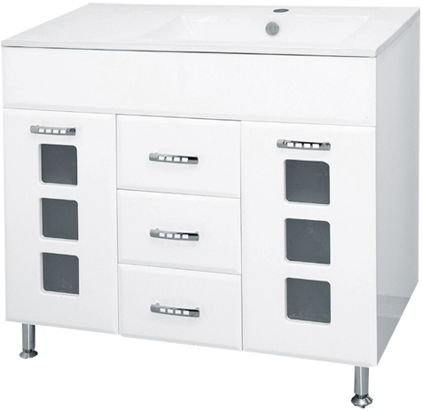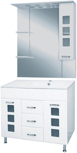 - тумба под раковину: 2 распашные дверцы с вставками матового стекла, 3 выдвижных ящика, 5 металлических ручек, комплект опорных ножек и крепления