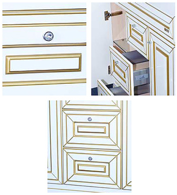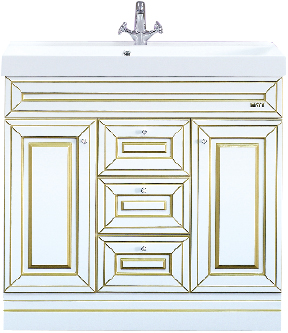 - тумба под раковину: 2 распашные дверцы, 3 выдвижных ящика, хромированные ручки с кристаллом.