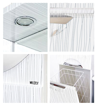 Комплектация: зеркальное полотно с двумя полками, козырек со встроенными светильниками. Справа распашной шкаф.