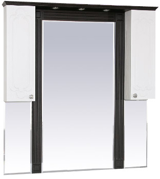 Комплектация: зеркальное полотно с козырьком со встроенной подсветкой. Распашные шкафчики с ручками, инкрустированными кристаллами, и вкладными полками.