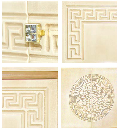 Комплектация: зеркальное полотно с полками, козырьком со светильниками. Распашные шкафы с резным фасадом и вкладными полками. Ручки золотистые с кристаллами.