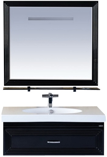 Комплектация: зеркало для ванной в раме с подсветкой и полкой.