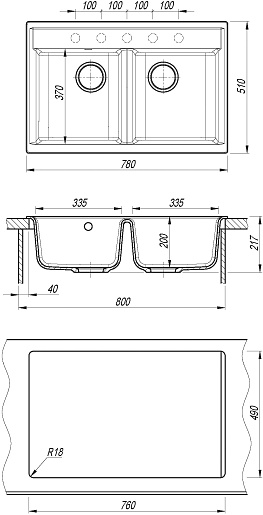 - 5 размеченных отверстия под смеситель.