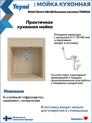 Teymi Мойка кухонная Helmi Smart 42 кварцевая бежевая матовая