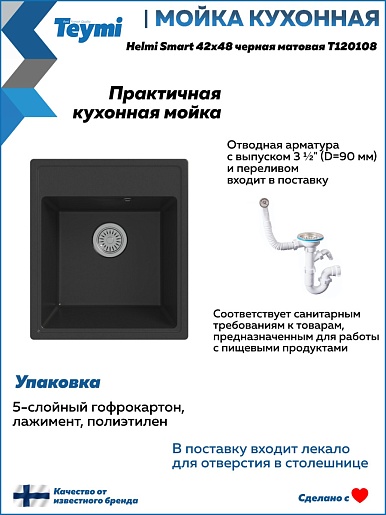 Teymi Мойка кухонная Helmi Smart 42 кварцевая черная матовая
