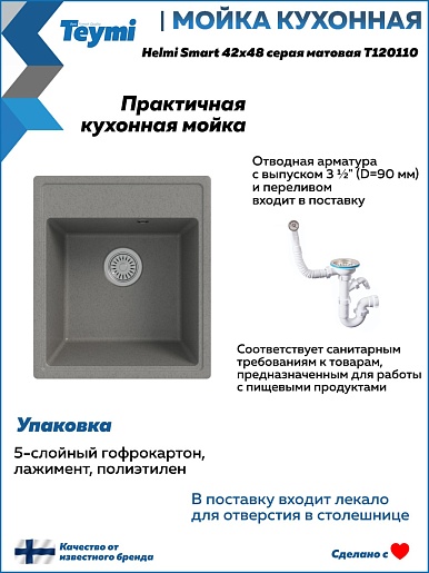 Teymi Мойка кухонная Helmi Smart 42 кварцевая серая матовая