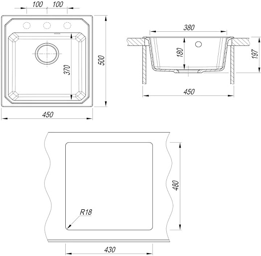 - 3 размеченных отверстия под смеситель.