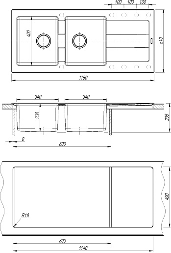 - Размер чаш (ШxГxВ): 340 х 400 х 230 мм.