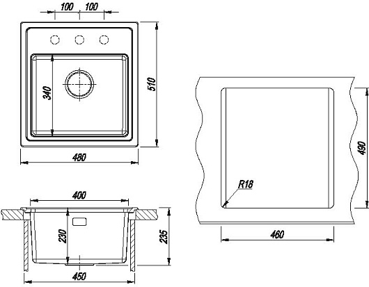 - 3 размеченных отверстия под смеситель.