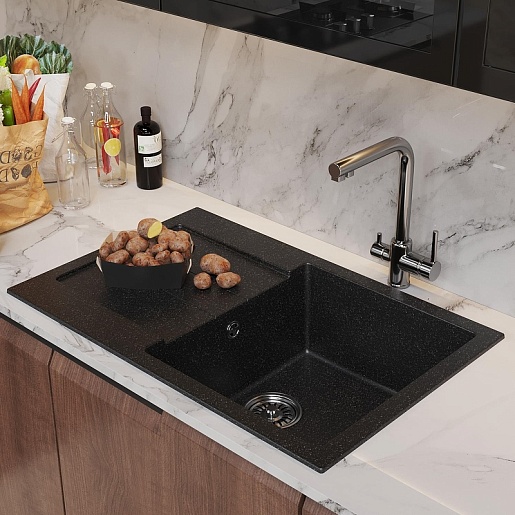 - Мойка из искусственного мрамора: прочная, бесшумная и гигиеничная, легко ремонтируется, устойчива к высоким температурам, проста в уходе, производится в разных оттенках.