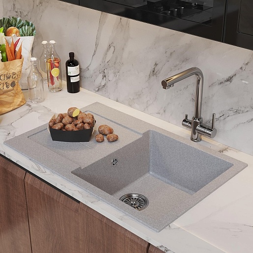 - Мойка из искусственного мрамора: прочная, бесшумная и гигиеничная, легко ремонтируется, устойчива к высоким температурам, проста в уходе, производится в разных оттенках.