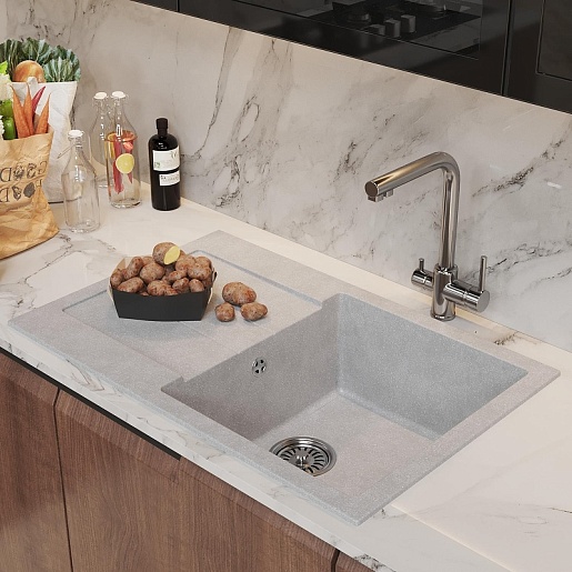 - Мойка из искусственного мрамора: прочная, бесшумная и гигиеничная, легко ремонтируется, устойчива к высоким температурам, проста в уходе, производится в разных оттенках.