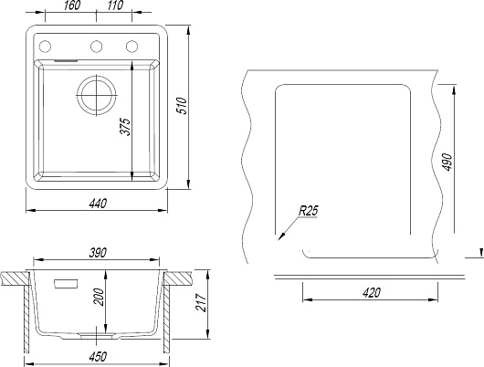 - Размер чаши (ШxГxВ): 390 х 375 х 200 мм.