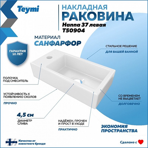 - Раковина Teymi Hanna 37 левая, подвесная и накладная с полочкой под смеситель, белая T50904.- Размеры (Ш Г)-37x18,5 см.