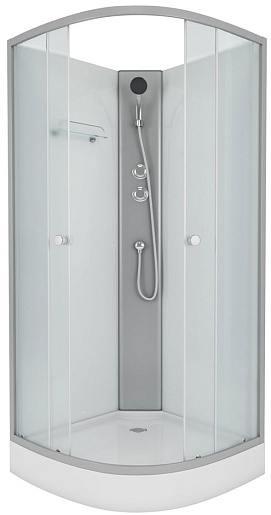 У кабины нет крыши, поэтому отсутствует верхний душ, однако благодаря удобному держателю лейки можно создать его аналог при использовании ручного душа. Смеситель работает в одном режиме. Задние стенки кабины выполнены из белого стекла, передние стёкла толщиной 5 миллиметров – матовые.- акриловый поддон на каркасе