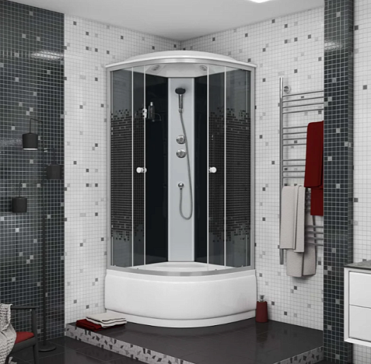 Кабина белого цвета удачно контрастирует с чёрными задними стенками. Передние стёкла раздвижных дверец обладают оригинальным мозаичным дизайном, который хорошо будет смотреться в любой комнате.- акриловый поддон на каркасе