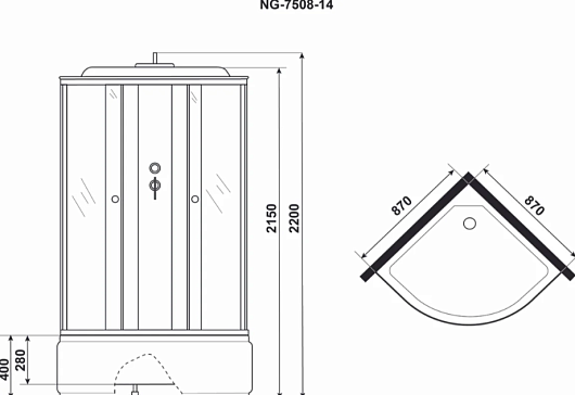NG-7508-08 – душевая кабина, объединившая в себе изысканный дизайн и неизменный комфорт на протяжении всего срока эксплуатации. Чтобы достичь его, производители изготовили профиль из хромированного алюминия, стойкого к резкому перепаду температур, очень высокой влажности и активному механическому воздействию. Акриловый поддон высотой 40 сантиметров обладает дополнительным усилением, существенно продлевающим срок его службы. Габариты кабины составляют 90х90х215 сантиметров, форма – четверть круга.