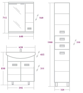 - тумба под раковину: распашные дверцы, полка внутренняя, ручки врезные - металл (хром), ножки передние - пластик (хром), ножки задние (регулируемые) - пластик