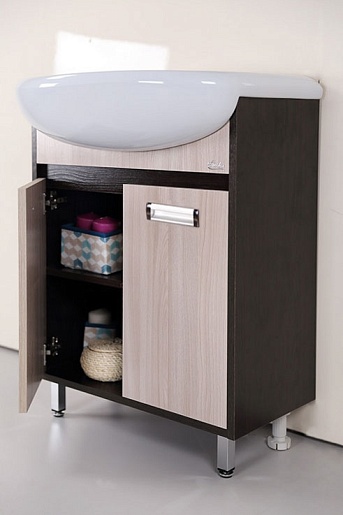 - тумба под раковину: 2 распашных дверцы, вкладная полка, 2 ручки (хром), 4 ножки, комплект полкодержателей, комплект доводчиков