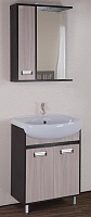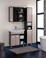 Комплектация: влагостойкое зеркальное полотно с боковым шкафчиком с распашной дверцей с механизмом доводчика. Внутренние отделение с полочками. Хромированная фурнитура, фасад и корпус из влагостойкого ЛДСП покрытого шпоном.