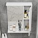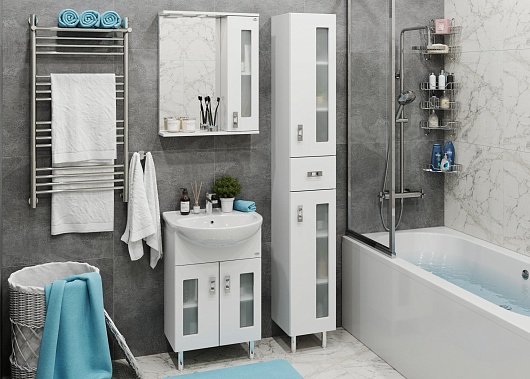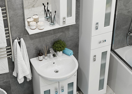 - Влагостойкое зеркальное полотно с полочкой, справа - шкафчик с распашной дверцей из МДФ, декорированный вставкой из матового, закаленного стекла.